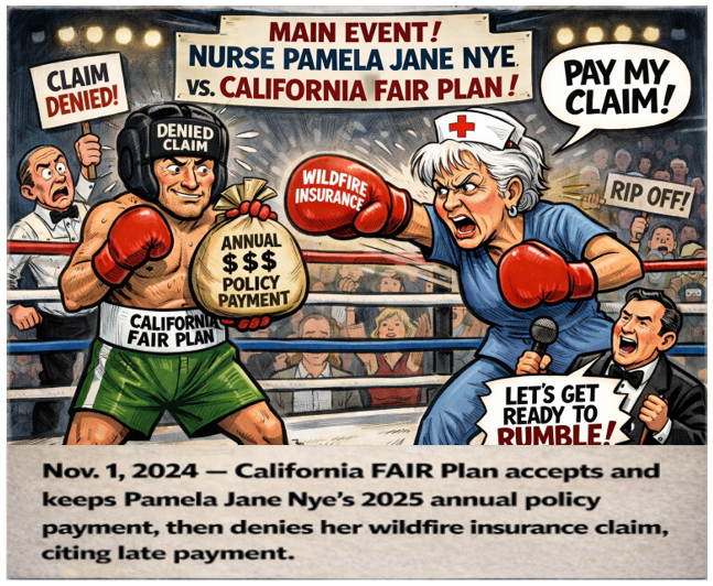 - September 23, 2025 -- CFP informed Nye, "We conducted a thorough review, and your California FAIR Plan policy terminated October 24, 2025, due to nonpayment of premium. Therefore, we must respectfully deny your claim as there was no policy in force at the time of the loss. As of today your claim is closed. If you have any questions regarding any of the foregoing and/or decision with respect to your claim, or if there is additional information you would like us to consider, please contact the undersigned. - Jessica Mansfield, Claims Examiner III.